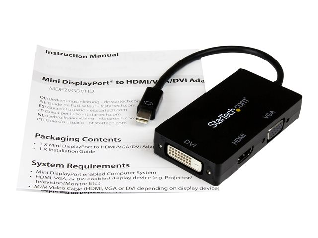 - Three-in-one adapter - mDP to VGA, mDP to HDMI and mDP to DVI