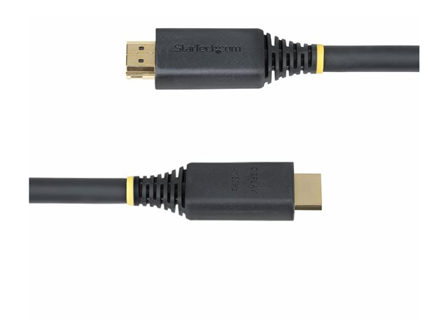 The 15 m Active High Speed HDMI Cable by StarTech.com is designed to deliver performance in connecting high-definition devices. With its shielded technology and aluminum mylar foil with braid, this cable ensures minimal signal interference. Whether streaming 4K content at 60 Hz or gaming at 1080p with 240 Hz refresh rate, this cable delivers video quality. Featuring 12-bit Deep Color and support for up to 32 audio channels, immersive audio and video experiences are provided. The durable design includes strain relief and a robust outer diameter of 9 mm, ensuring long-lasting performance, backed by a lifespan of 10,000 insertions and 2,000 bends. The 15 m length accommodates flexible installation options for your home setup, making it a choice for both professional and personal use.