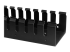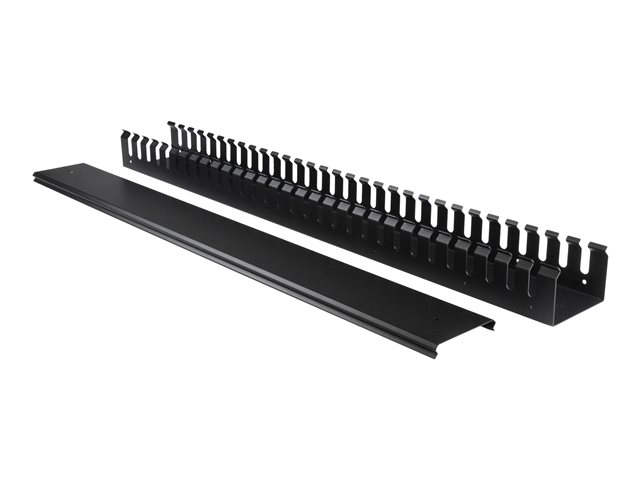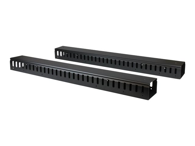 The two-piece cable manager runs vertically along the side of your rack, to neatly guide cables between equipment that's mounted at different heights. This provides a tidy and well-organized way to run cables from devices mounted toward the bottom of your rack to other devices mounted near the top, without leaving a mess of cables hanging in between.