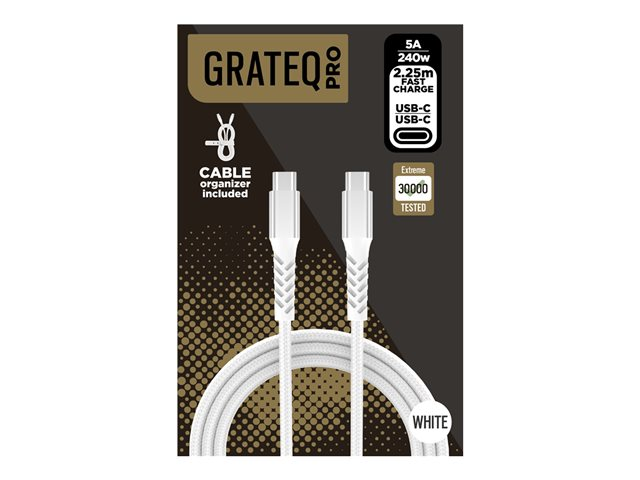 Produktbeskrivelse GRATEQ PRO - USB Type-C kabel - 24 pin USB-C til 24 pin USB-C - 2.25 m Type USB Type-C kabel Egenskaber USB Power Delivery (240 W), synkronisering og opladning, flettet, Quick Charge 3.0, hurtigtopladende support, programmerbar strømforsyning (PPS), understøttelse af superhurtig opladning, 30000 bøjninger levetid, aluminium stik Kabel længde 2.25 m Forbindelsesled 24 pin USB-C - han Stikforbindelse (anden ende) 24 pin USB-C - han Vurderet strøm 5 A Farve Hvid -