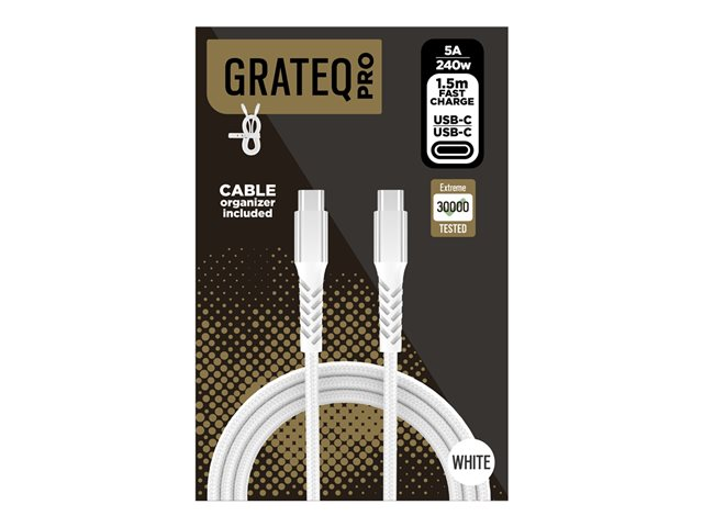 Produktbeskrivelse GRATEQ PRO - USB Type-C kabel - 24 pin USB-C til 24 pin USB-C - 1.5 m Type USB Type-C kabel Egenskaber USB Power Delivery (240 W), flettet kabel, synkronisering og opladning, Quick Charge 3.0, programmerbar strømforsyning (PPS), understøttelse af superhurtig opladning, 30000 bøjninger levetid, aluminium stik Kabel længde 1.5 m Forbindelsesled 24 pin USB-C - han Stikforbindelse (anden ende) 24 pin USB-C - han Vurderet strøm 5 A Farve Hvid -