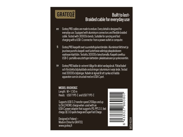 Ud over sine specifikationer har kablet funktioner som Quick Charge 3.0-teknologi og understøttelse af Programmable Power Supply (PPS), hvilket giver fleksible opladningsmuligheder. Med en levetid på 30.000 bøjninger er det bygget til at holde i krævende miljøer. Uanset om det er til hjemmebrug eller på farten, er GRATEQ USB-C-kablet et pålideligt valg til hurtig opladning og højhastighedsdataoverførsel, der opfylder moderne forbindelsesbehov.