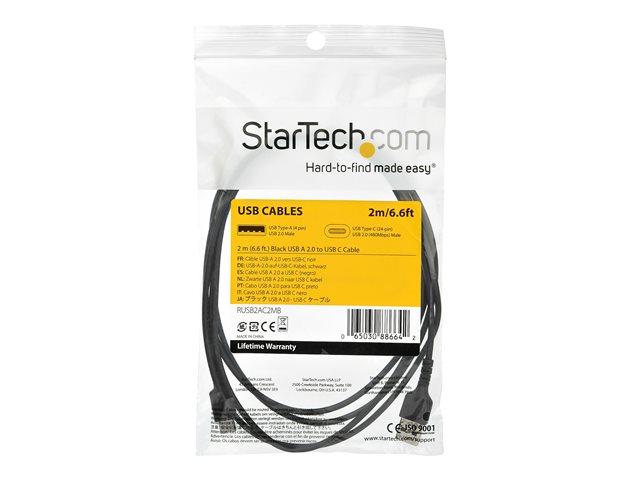 StarTech.com 2m USB A to USB C Charging Cable, Durable Fast Charge & Sync USB 2.0 to USB Type C Data Cord, Rugged TPE Jacket Aramid Fiber M/M 3A Black, Samsung S10, S20, iPad Pro, Pixel