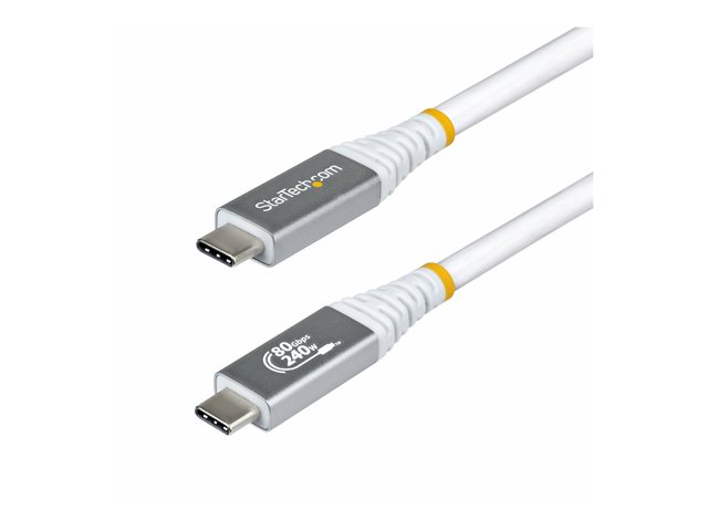 The StarTech.com CC50CM80GUSB4CABLEW is a USB-C cable designed to meet the demands of modern technology. With a data rate of up to 80 Gbps, this cable enables rapid data transfer, ensuring smooth operation for high-resolution displays and data-heavy applications. HDR support allows for vibrant visuals, while compatibility with HDMI 2.1 and advanced DisplayPort features makes it suitable for various uses, from gaming to professional media editing. This cable incorporates features like an E-marker chip for enhanced performance and EMI protection to maintain signal integrity. With support for 4K at 120Hz and 8K at 60Hz, this cable is suitable for high-definition streaming and gaming. Its robust construction, using thermoplastic elastomer (TPE) for the jacket material, ensures flexibility and durability, making it a reliable choice for connecting devices.