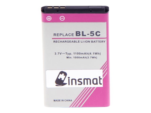 Produktbeskrivelse Insmat batteri - Li-Ion Produkttype Batteri Batteri Litiumion - 1100 mAh - 4.1 Wh Fabrikants batterinavn Nokia BL-5C Designet for Nokia 105, 107, 111, 11XX, 12XX, 130, 1315, 16XX, 1800, 207, 208, 215, 21XX, 222, 22XX, 23XX, 26XX, 27XX, 31XX, 36XX, 5030, 5130, 60XX, 61XX, 62XX, 6555, 66XX, 68XX, 7610, C1, C2, E50, E60, N70, N71, N72, N91, X2; Asha 202, 203; N-Gage Game Deck -