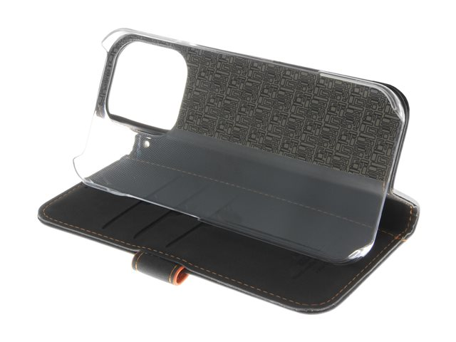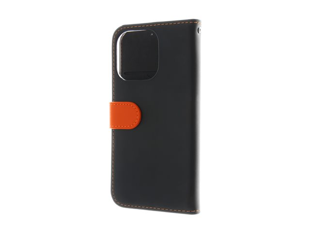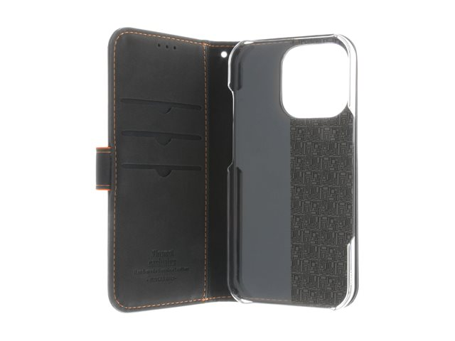 ægte læder, karton+papir+aluminiumsfolie, polycarbonat (PC), bomuldssyninger - sort/orange - for Apple iPhone 16 Pro
