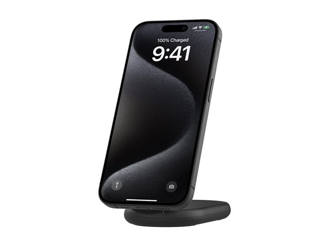 The Belkin BoostCharge wireless charging stand features a sleek design with a foldable structure, making it convenient for both travel and home use. It is equipped with magnetic alignment and is compatible with MagSafe, allowing for a secure and efficient charging experience for cellular phones. The charging stand provides up to 15 W of power and supports fast charging with Power Delivery 3.1, ensuring devices recharge quickly.