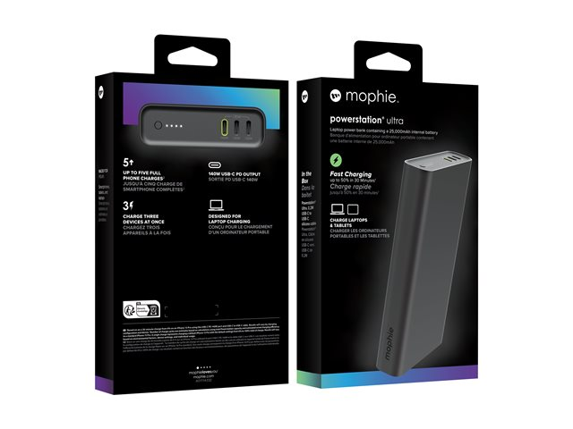 Mophie powerstation ultra er fremstillet af slidstærkt silikone og anodiseret aluminium og kombinerer funktionalitet med bærbarhed i et kompakt design. LED-indikatoren holder styr på strømniveauerne, så brugerne er klar over deres opladningsstatus. Med en effekt på 140 watt og Power Delivery-hurtigopladningsteknologi leverer mophie powerstation ultra effektiv opladning og sikrer, at dine enheder er klar, når du har mest brug for dem.