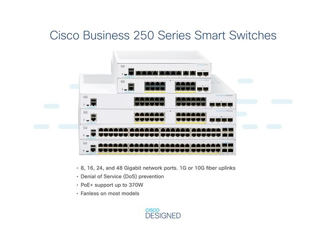 Med Cisco Business 250 Series Smart Switches kan du opnå netværksydelse og -sikkerhed på virksomhedsniveau uden at betale for avancerede netværksfunktioner, som du ikke kommer til at bruge. Når du har brug for en pålidelig løsning til at dele online ressourcer og forbinde computere, telefoner og trådløse adgangspunkter, giver Cisco Business 250 Series Smart Switches den ideelle løsning til en overkommelig pris.