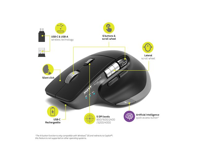 Denne mus er udstyret med seks knapper, herunder et rullehjul og et sidet rullehjul, hvilket øger produktiviteten. Den lydløse klikfunktion sikrer et stille arbejdsmiljø, mens FreeWheel-teknologien giver jævn rulning for en mere effektiv navigationsoplevelse. Pakken indeholder en trådløs USB-modtager, et USB-opladerkabel og en adapter fra USB Type-A hun til USB-C han, hvilket giver bekvemmelighed og tilgængelighed.