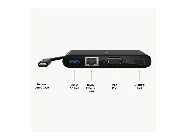 - USB-C to Multi-port adapter with Ethernet, USB-A 3.0, VGA, and 4K HDMI ports