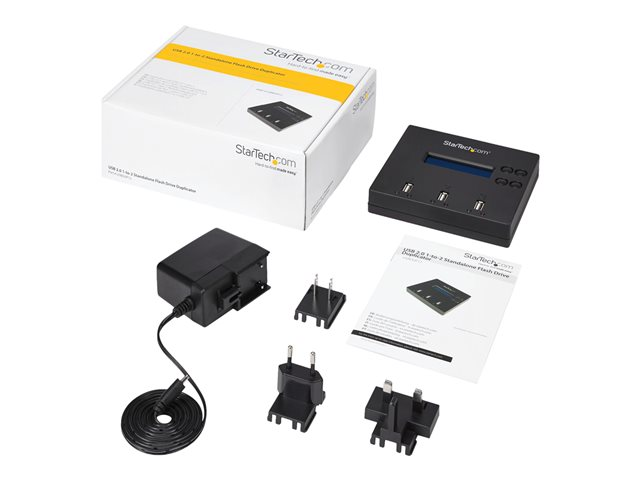 This standalone USB duplicator lets you clone or erase two flash drives without connecting to a host computer.