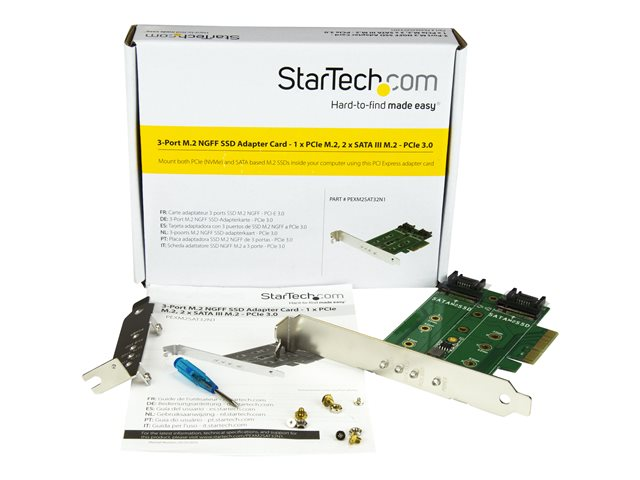 Mount both PCIe (NVMe) and SATA based M.2 SSDs inside your computer using this PCI Express adapter card. This 3-port M.2 SSD adapter card is one of the only cards that supports both PCIe and SATA-based M.2 SSDs (solid-state drives). It's a versatile way to expand the overall storage capacity of your desktop PC or server. Plus, because it supports a high-speed PCIe M.2 drive, you can increase the speed and performance of your computer.