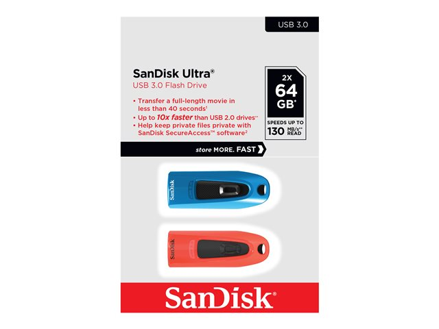 SanDisk Ultra - USB flashdrive - 64 GB - USB 3.0 - blå, rød (pakke med 2) SDCZ48-064G-G46BR2