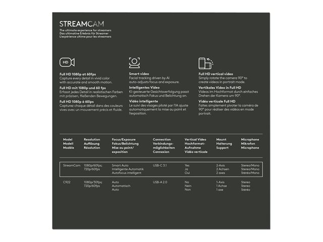 Take your content to the next level and share your passion with Logitech StreamCam. Featuring pristine image quality, dual front-facing microphones, versatile mounting options, and USB-C connectivity, it's the perfect camera for broadcasting to your favorite streaming platforms - all you need to do is be yourself!