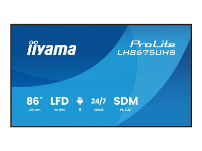 Iiyama ProLite LH8675UHS-B2AG tilbyder en fantastisk seeroplevelse med sin 86-tommer LED-baggrundsbelyste LCD-fladskærm med en opløsning på 3840 x 2160 i et billedformat på 16:9. Denne skærm er designet til kommerciel brug og fungerer både i liggende og stående tilstand, hvilket gør den alsidig til forskellige digital skiltningsapplikationer. Med en lysstyrke på 500 cd/m² og en bred betragtningsvinkel på 178 grader sikrer den klar synlighed fra flere perspektiver. Den indbyggede medieafspiller og Smart Display Module-slot giver praktiske muligheder for indholdsstyring, mens den antirefleksbelægning hjælper med at opretholde billedklarheden under forskellige lysforhold. Med et energieffektivt design og udstyret med flere indgangs- og udgangsmuligheder er denne skærm positioneret til at imødekomme kravene til 24/7 drift.