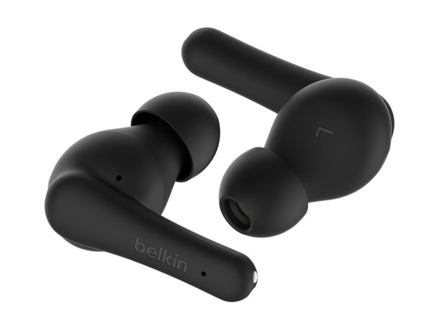 Belkin SoundForm true wireless earphones provide an immersive audio experience with Bluetooth 5.4 connectivity, allowing for seamless wireless listening. Featuring Active Noise Canceling technology, these earphones are designed to block distractions and enhance your listening pleasure. The built-in microphone ensures clear call quality, while the multi-point technology enables connection to two devices simultaneously. With sound effects and three sound modes optimized for different environments, this product adapts to various listening needs. The earphones come equipped with a rechargeable battery and a fast charge feature for use.