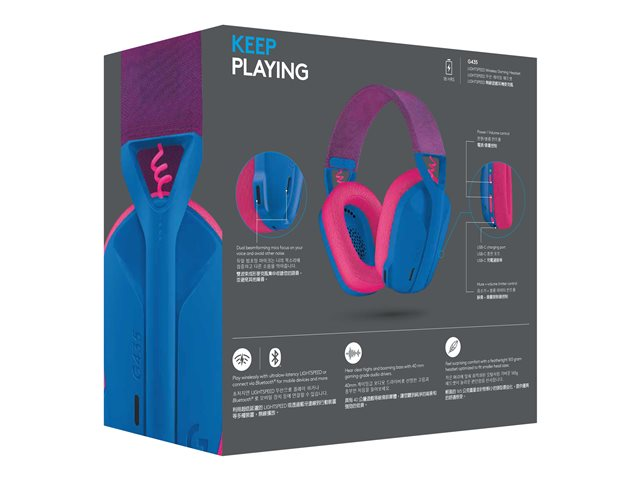 Logitech G435 LIGHTSPEED trådløst gaming headset En trådløs LIGHTSPEED og Bluetooth-forbindelse med hurtig reaktionstid lader dig spille og snakke på PC, Mac, PS5/PS4, smartphones og andre lydaktiverede Bluetooth-enheder. Lyd i gaming-kvalitet med nøje balanceret hi-fi lyd, 40 mm lyddrivere og kompatibilitet med Dolby Atmos og Windows Sonic giver den ultimative surround sound til alle dine gaming-eventyr. Med Dual Beamforming-mikrofoner som reducerer baggrundsstøj uden en mikrofonarm. Desuden er G435 tilgængelig i flere farver så du kan matche din favoritstil til dit gaming-setup.