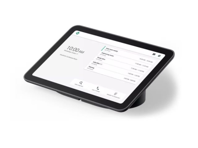 The touch control display, powered by a single Ethernet cable lists active meetings and allows for room and setting controls. You can also join touch-free by saying, "Hey Google, join the meeting".