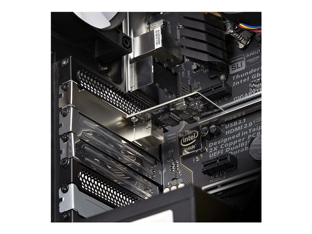 The StarTech.com 1-Port Gigabit PCIe Network Adapter Card enhances connectivity with a data transfer rate of 1 Gbps. This plug-in card supports various Ethernet cabling types, ensuring compatibility with different network setups. With a maximum operating temperature of 70°C and the ability to handle a humidity range of 10% to 80%, it performs reliably in various environments.