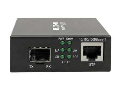 Eaton Tripp Lite Series Gigabit SFP Fiber to Ethernet Media Converter, POE+, International Power Cables, 10/100/1000 Mbps - Fibermedieomformer - 1GbE - 10Base-T, 100Base-TX, 1000Base-T - RJ-45 / SFP (mini-GBIC) - op til 100 m - for P/N: N001-025-BK, N201-025-BL, N286-01GLX-SLX, N286-01GSX-MDLC N785-INT-PSFP
