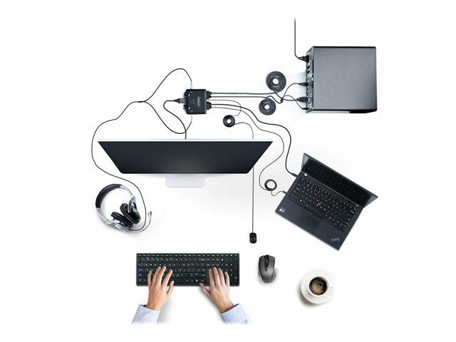 • 4K 60 Hz hybrid KVM switch - enables switching between a USB-A/HDMI desktop and a USB Type-C DP-Alt Mode enabled laptop to share a keyboard, mouse, audio input/output devices, and a single 4K 60 Hz HDMI monitor