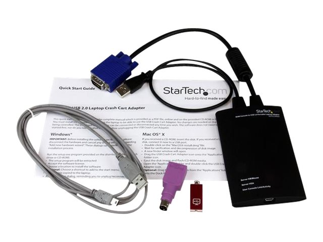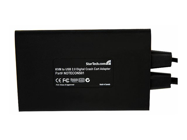 Forvandl enhver laptop til en konsol til headless servere, pc'er, pengeautomater, kiosker og meget mere. NOTECONS01 KVM Console to USB 2.0 Portable Laptop Crash Cart Adapter forvandler din notebook eller netbook til en bærbar server crashcart, så du slipper for at slæbe rundt på en stor, tung og uhåndterlig videoskærm, tastatur og mus. Denne adapter leverer VGA-strømmen fra enhver værtscomputer til en bærbar computer og emulerer den bærbare computers mus- og tastaturudgange for enkel adgang til og kontrol af tilsluttede servere, pc'er eller andre "hovedløse" enheder.