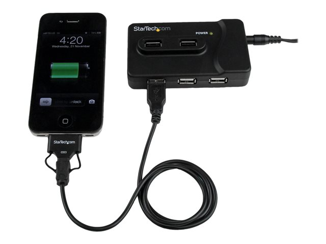 The hub includes an external power adapter, which when connected enables charging some portable electronic devices (e.g. an iPhone or other Smartphone), even without a USB connection to a host computer.