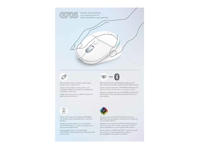 G705 Wireless Gaming Mouse i Aurora-serien er udformet med henblik på komfort og kontrol med et design, der bevidst er tilpasset mindre hænder. Har trådløs LIGHTSPEED-teknologi i gamingkvalitet, LIGHTSYNC RGB og avanceret spilteknologi.