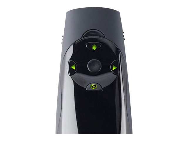 You can't make your point if no one can see it. So make your point with a bright green laser suitable for even the biggest rooms and brightest screens with the Kensington Presenter Expert green laser presenter with cursor control. Some of today's bright LCD and plasma screens pose a real challenge for red laser pointers. But not for the green laser on the Kensington Presenter Expert green laser presenter. It's 10 times brighter than standard red lasers, so it stands out against even the brightest LCD and plasma displays. Of course there's more to a great wireless presenter than just a bright pointer. The Presenter Expert's intuitive four-button design makes it easy to navigate your Keynote or PowerPoint presentation. And when you need to move your cursor, a quick flip of a button gives you full cursor control. The powerful 2.4 Ghz remote resists interference and lets you control Keynote or PowerPoint from up to 150 feet away. The USB receiver stores inside the presenter so you won't have to worry about misplacing it. You won't have to worry about not being able to find the right remote button either, because the Kensington Presenter Expert has backlit buttons.