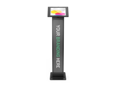 Our BrandMe floor stand allows you to utilize a panel for branding, call to action or custom design to bring attention to your interactive display or kiosk. The tilting mount allows the iPad enclosure to be set in either portrait or landscape mode and the stand base offers additional security features, securing the power source and bolting the unit to the floor.