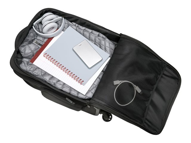 - Quick-access workstation pocket organises your chargers, pens, business cards and more.
