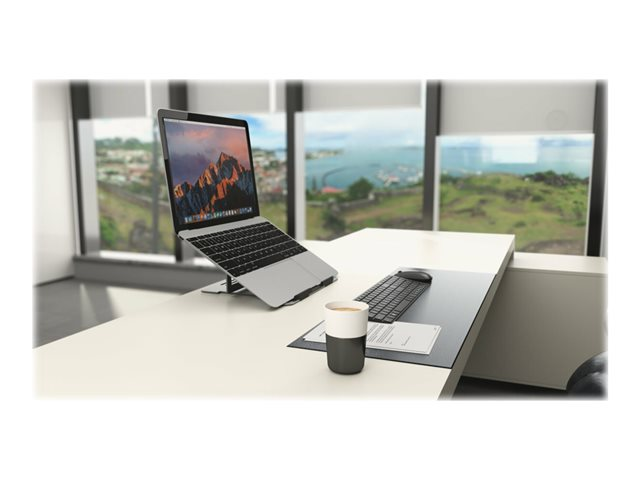Hybrid working has expanded the need for users to be comfortable and productive - not only in the office, but at home or wherever they are working. The demand for environmental sustainability has also expanded. Easily portable and constructed of durable, lightweight, sustainable aluminum, the Easy Riser aluminum laptop riser supports virtually any size laptop up to 16" and includes 6 levels of height/angle adjustment for optimal viewing. Open ventilation enhances air circulation and laptop cooling. With light weight, the Easy Riser folds flat for easy portability and travel convenience.